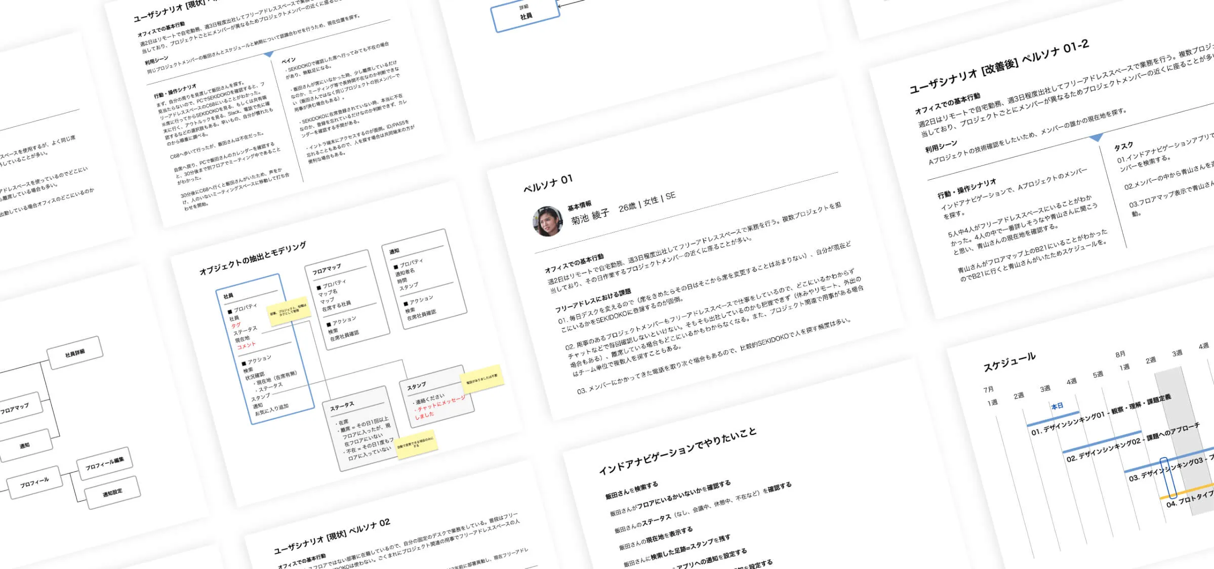 地磁気を用いた屋内位置情報サービスを活用し、フリーアドレスフロアで誰がどのスペースを使用しているのかを検索するアプリのPoC開発では、株式会社JR東日本情報システム様のデザイナー、エンジニアと共にデザインシンキングワークショップのファシリテートもおこないました。ペルソナ、ユーザーシナリオをについてもディスカッションを重ね、最終的なデザインとプロトタイプ開発までおこないました。
